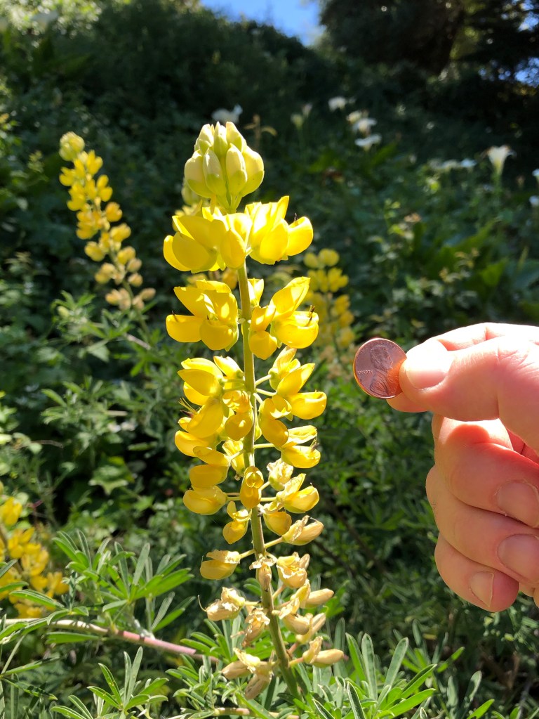 Above image: Tree Lupine: Yellow Bush Lupine (Lupinus arboreus) 2-9′ tall, flowering March – June in sandy areas and canyons near the Pacific Ocean.