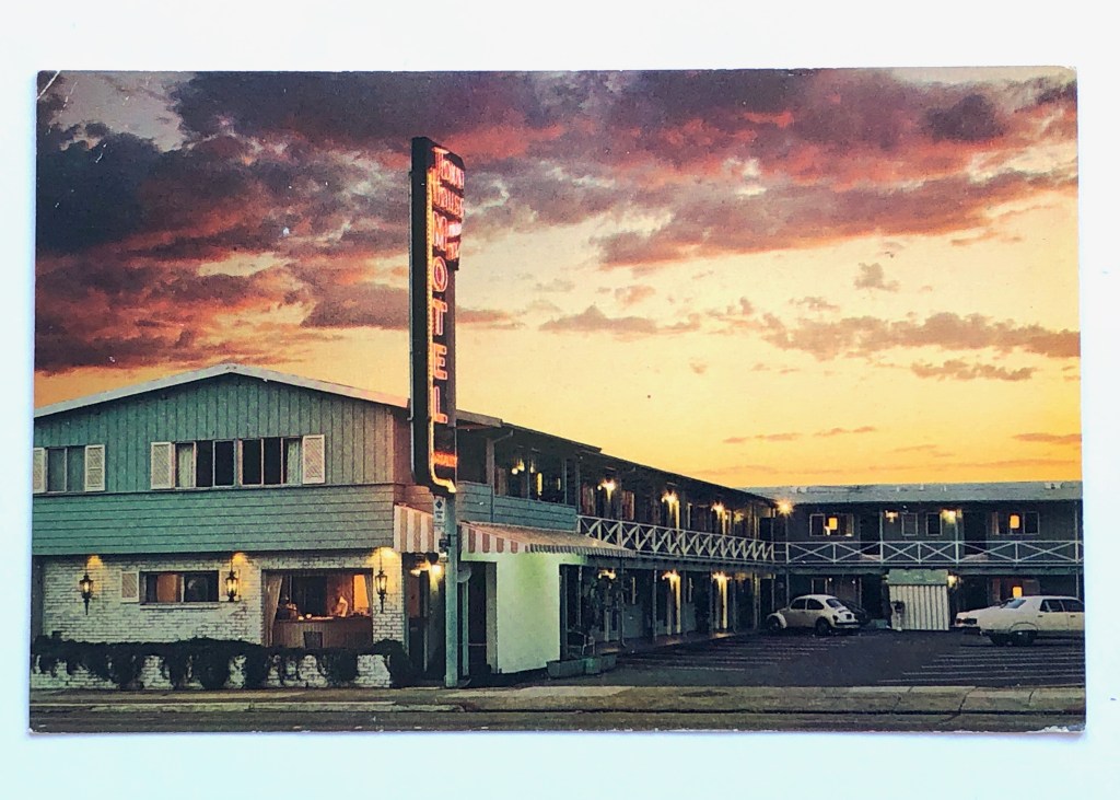 The motels all had a “rancho” styling popular then. Shingles and bricks were prevalent and open western style railings made the motels look quaint and family friendly. The “new” ’80s color scheme makes you think the Golden Girls cast would love it here.