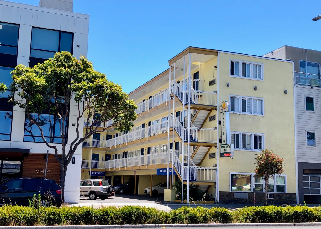 Ah, the old De Ville Motel, she was a nice example of mid-century architecture. The toned down color-scheme, minimal decoration and combination of man-made and natural materials made for a nice look. No wonder MCM is so popular today. If you were a traveler in the ’50s coming off the Golden Gate Bridge in your car and you saw this, it would spark a little excitement for things to come in San Francisco.